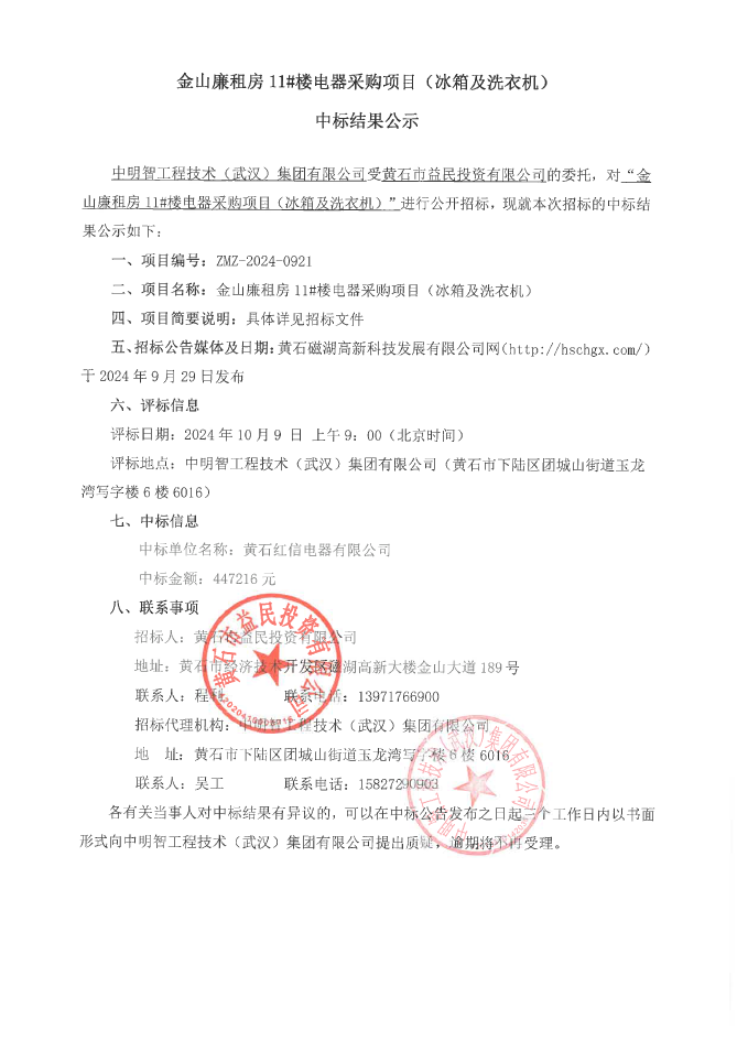金山廉租房11#樓電器采購項目(冰箱及洗衣機)中標結果公示