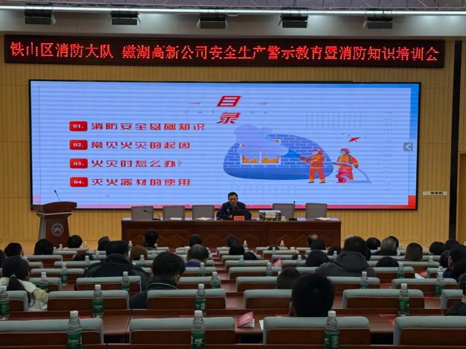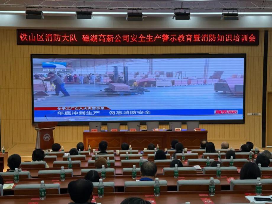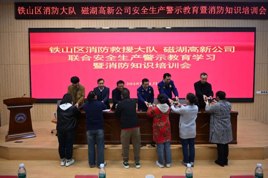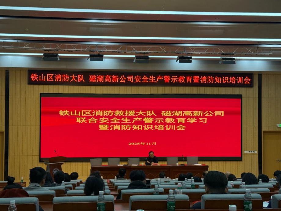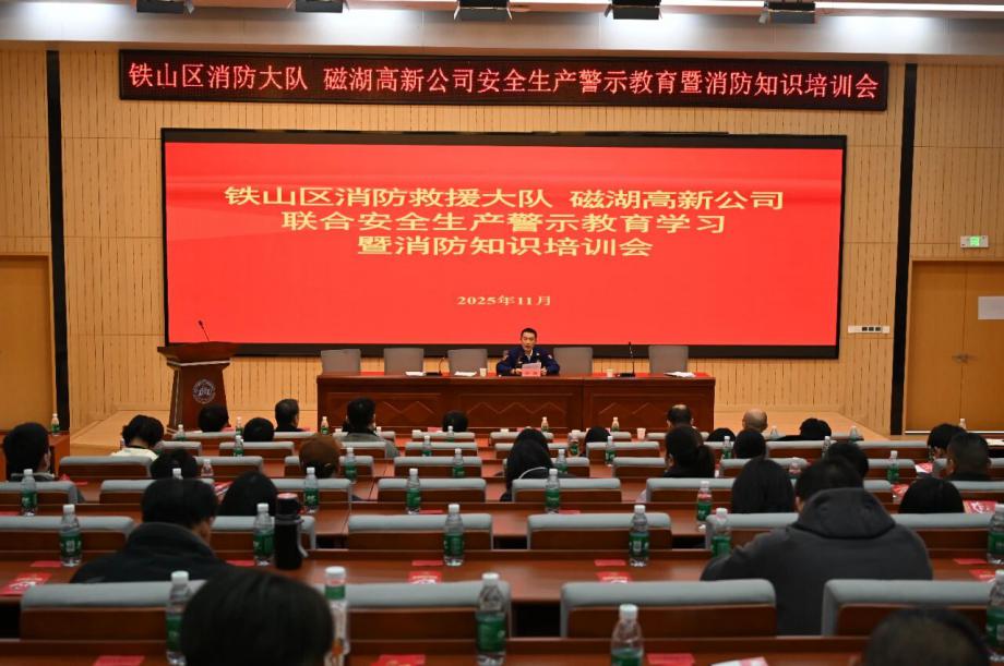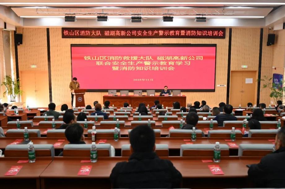 為深刻汲取近期火災事故教訓,全面壓實(shí)安全生產(chǎn)責任,切實(shí)提升園區整體消防安全管理水平,營(yíng)造“119消防宣傳月”濃厚氛圍,鐵山區消防救援大隊與磁湖高新公司于11月19日聯(lián)合舉辦安全生產(chǎn)警示教育學(xué)習暨消防知識培訓會(huì )。會(huì )議聚焦“全民消防、生命至上——安全用火用電”主題,通過(guò)文件學(xué)習、警示教育、專(zhuān)業(yè)培訓、責任落實(shí)與設備保障等多措并舉,為企業(yè)安全生產(chǎn)與商戶(hù)安全經(jīng)營(yíng)注入強心劑。區消防救援大隊黨委書(shū)記徐耀,磁湖高新公司黨委副書(shū)記、總經(jīng)理蔡華中出席會(huì )議并講話(huà),園區企業(yè)安全負責人、商業(yè)門(mén)面承租戶(hù)代表等150余人參加會(huì )議。