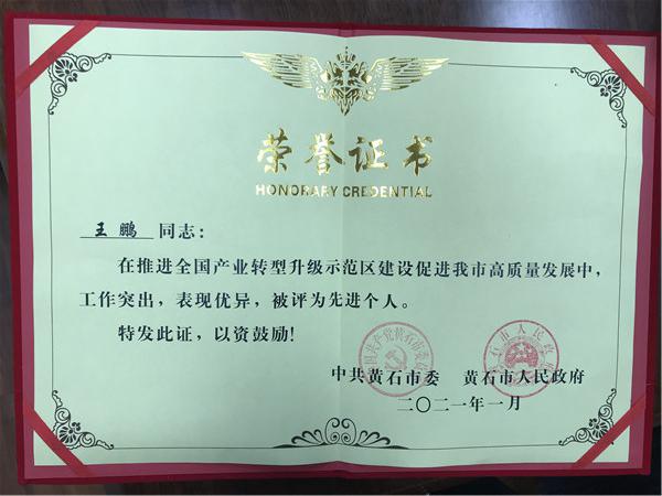 2月19日,在全市“思想破冰 引領(lǐng)發(fā)展”主題活動(dòng)暨深入優(yōu)化營(yíng)商環(huán)境動(dòng)員大會(huì )上,中共黃石市委、黃石市人民政府發(fā)布了《關(guān)于表彰黃石市治理能力建設突出貢獻和促進(jìn)轉型升級推進(jìn)高質(zhì)量發(fā)展先進(jìn)集體和先進(jìn)個(gè)人的決定》。黃石經(jīng)開(kāi)投項目建設管理有限公司總經(jīng)理王鵬同志榮獲“黃石市促進(jìn)轉型升級推進(jìn)高質(zhì)量發(fā)展先進(jìn)個(gè)人”稱(chēng)號。
