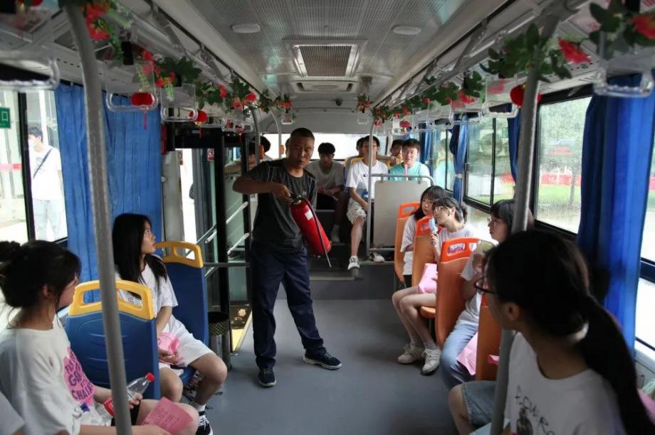 在公交車(chē)廂,駕駛員帶領(lǐng)同學(xué)們親身體驗在模擬突發(fā)狀況下,正確使用逃生錘、滅火器,并快速撤離現場(chǎng)等實(shí)操內容。