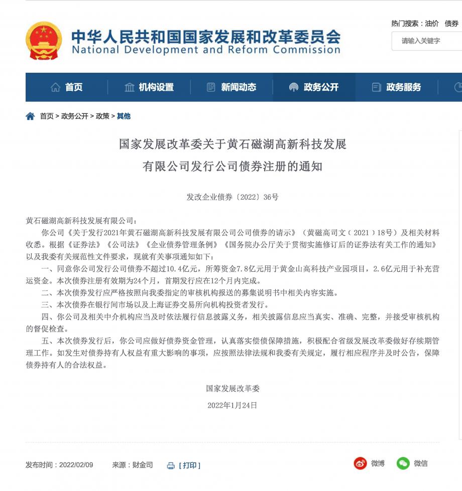 據國家發(fā)改委網(wǎng)站2月9日披露,“2021年黃石磁湖高新科技發(fā)展有限公司公司債券”已正式獲批,發(fā)行金額不超過(guò)10.4億元,募集資金將用于產(chǎn)業(yè)園區建設和營(yíng)運資金補充。
