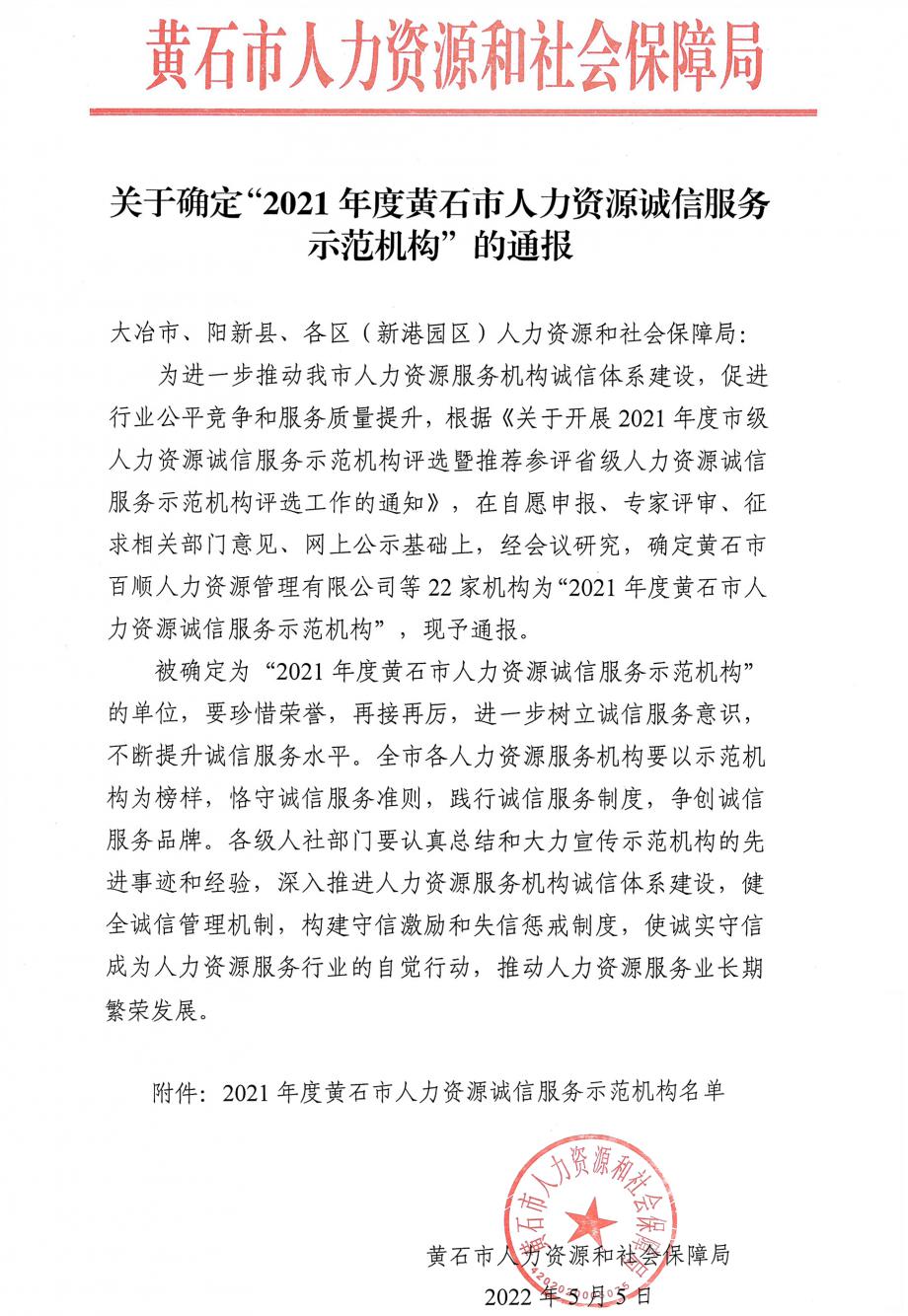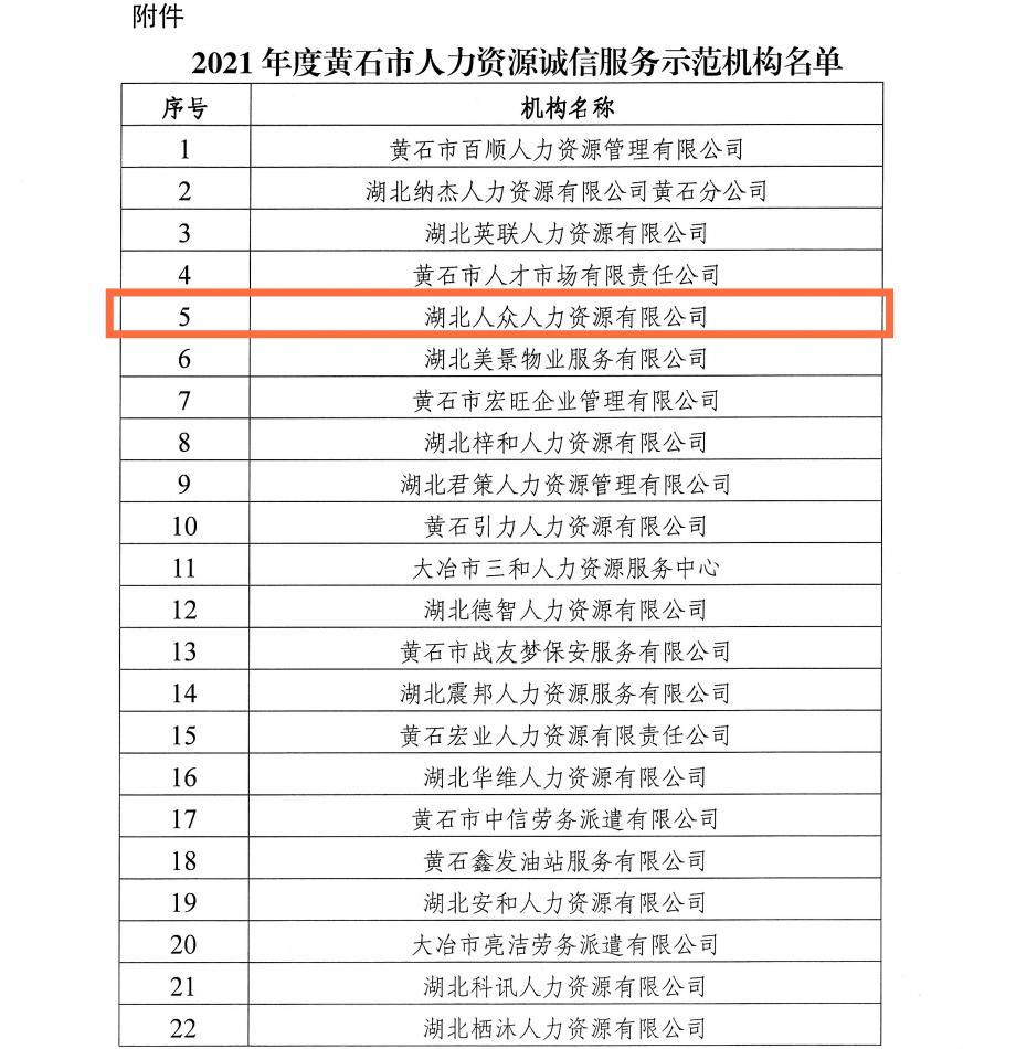 2021年度黃石市人力資源誠信服務(wù)示范機構名單