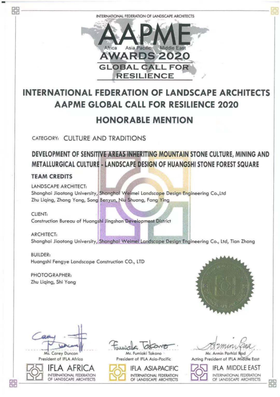 2020年,獲國際風(fēng)景園林師聯(lián)合會(huì )亞非中東地區榮譽(yù)獎。